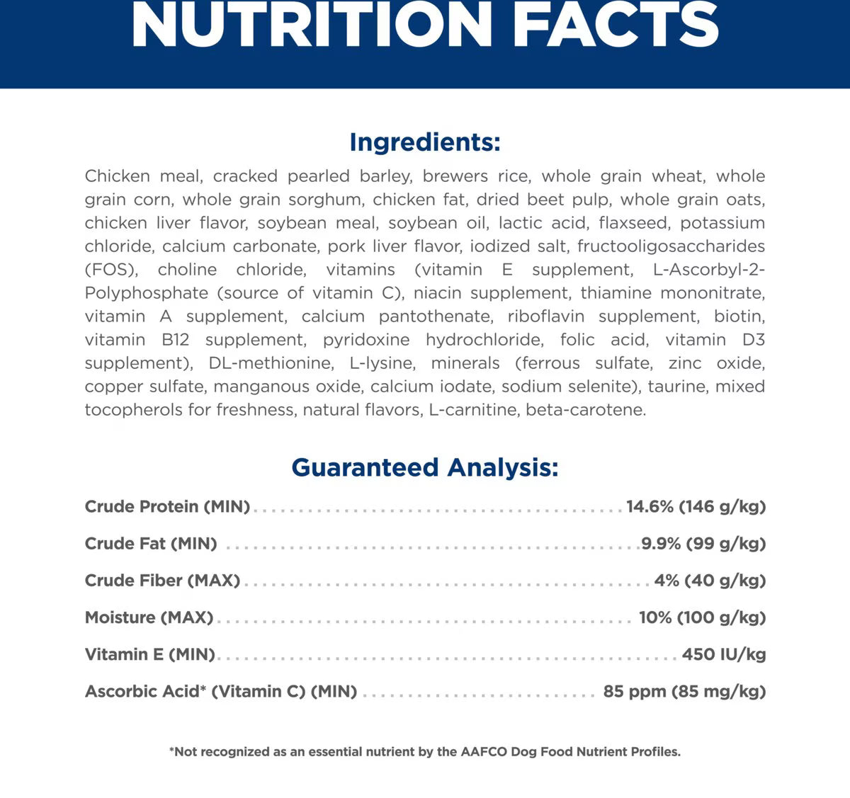 Support your furbaby through the prime of their life with Hill’s Science Diet Senior 7+ Small Bites Chicken Meal, Barley & Rice Recipe Dry Dog Food. This recipe is formulated to meet the specific needs of dogs age seven and up. The delicious chicken meal, barley, and rice recipe is packed into a tiny kibble for those pups that prefer variety, and the easily digestible ingredients help support the energy levels of mature dogs. This food is made with natural ingredients and contains a balanced set of minerals for heart and kidney health. Omega-6 fatty acids and vitamin E promote healthy skin and a shiny coat. Plus, this recipe even features a special blend of prebiotic fibers and antioxidants to support digestion, immune system, and organ health.